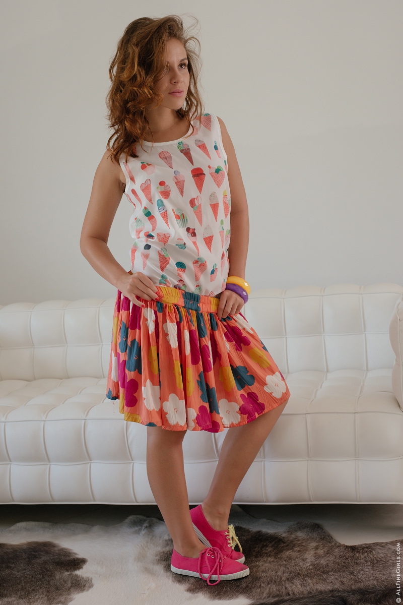 Colorful skirt and T-shirt of Ulia have to be taken off as soon as possible. Breathtaking girl feels comfortable showing private parts in professional 18OnlyGirls action. She spreads her slender legs sitting on the white leather couch and exposes hairless pussy.